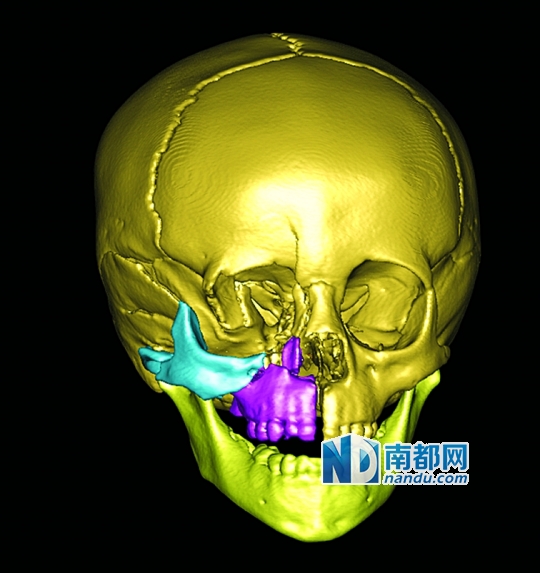 在电脑上先期做出的3D打印效果图,紫色、浅蓝色为缺损修复部分,边缘可打印出导板。